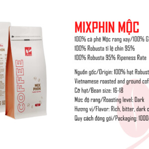 CT MIXPHIN là dòng cà phê pha phin đặc trưng của Việt Nam, sử dụng 100% Robusta S13 tuyển chọn, tỉ lệ chín 95%, kết hợp với hương bơ và caramel. Được rang đậm (Dark Roast), sản phẩm mang đến vị đắng rõ, hậu béo, hương thơm gỗ và caramel đặc trưng – cực kỳ phù hợp gu uống mạnh, đậm vị của người Việt.