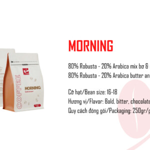 CT MORNING là dòng cà phê pha phin truyền thống, phối trộn từ 80% Robusta và 20% Arabica tẩm bơ & caramel, tạo nên hương vị đậm mạnh, hậu đắng nhẹ và mùi socola đặc trưng. Với kết cấu hạt size 16–18 và hương vị tròn đầy, MORNING đặc biệt phù hợp cho người thích vị cà phê Việt đậm đà, thơm ngậy, dùng vào buổi sáng.
