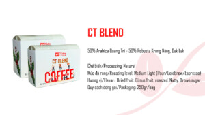 Cà phê CT Blend – Dạng túi giấy là sự kết hợp hài hòa giữa Robusta đậm đà và Arabica thơm nhẹ, mang đến hương vị cân bằng, dễ uống nhưng vẫn đủ chiều sâu cho người sành cà phê. Nguyên liệu được tuyển chọn từ những vùng trồng nổi tiếng như Đắk Lắk và Quảng Trị, đảm bảo chất lượng ổn định trong từng mẻ rang.